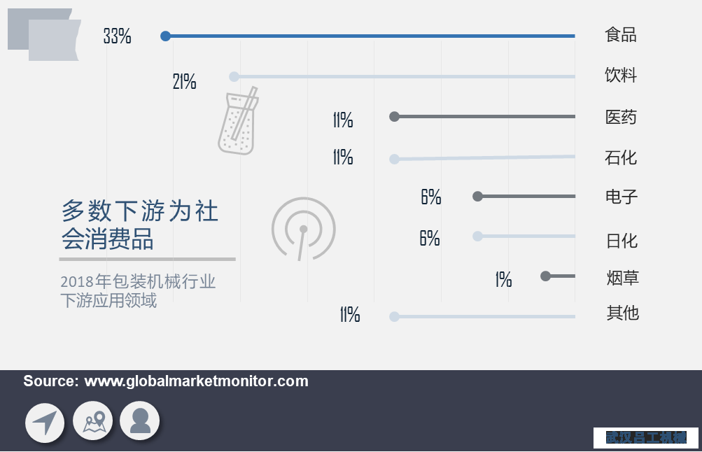 2019年,國內包裝設備制造行業的主營業務收入達到354.6億元,其中食品、飲料、醫藥是應用比例最高的三個市場,占整個包裝的65%。由于食品,飲料和藥品在宏觀經濟運作中的敏感性較低,因此包裝行業的下游需求在總體上是長期向好的,尤其是快消品領域和快遞領域業務擴張速度快。
