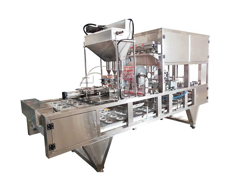 本機(jī)采用合理的機(jī)械傳動(dòng),功能齊全,灌裝、封口、切邊、制品推出,廢料收卷,印碼等自動(dòng)化工作,可節(jié)約人力,降低成本。本機(jī)有二次熱封裝置,料杯/碗/盒與封膜經(jīng)過前后二次熱封,封口牢固可靠。