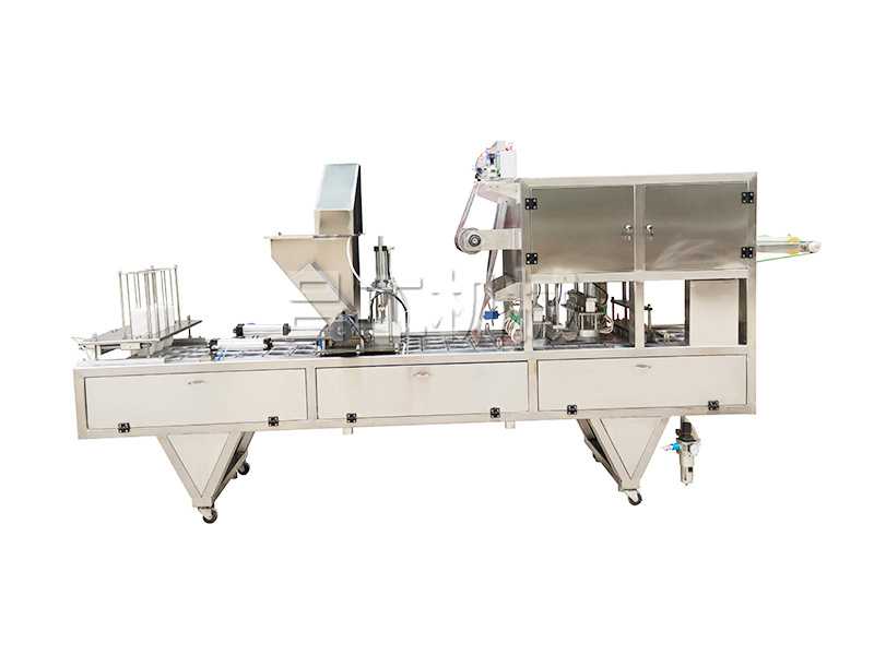 本機采用合理的機械傳動,功能齊全,灌裝、封口、切邊、制品推出,廢料收卷,印碼等自動化工作,可節(jié)約人力,降低成本。本機有二次熱封裝置,料杯/碗/盒與封膜經過前后二次熱封,封口牢固可靠。