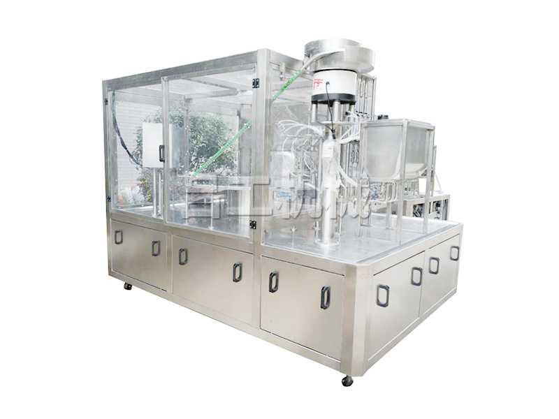 機器包含送袋、強注充填、料嘴清洗、理蓋盤自動理蓋、自動套蓋、電磁頭+齒輪旋蓋、成品排出。自動化程度高、使用方便、維修保養簡單、生產效益高等特點。可24小時連續工作。采用304不銹鋼、鋁合金、銅等